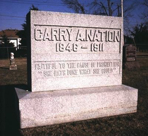 When she was 65, Carrie collapsed during a lecture and died in Leavenworth, Kansas. Today you can visit Carrie Nation’s grave in the Belton City Cemetery. Her homes in Arkansas and Kansas are still standing as well.