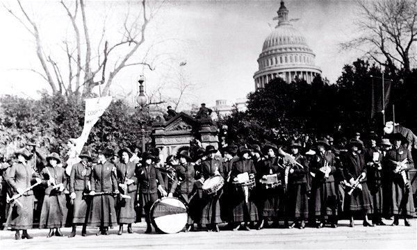 “We did not have time to stop and think about the really important thing we did when our band led the parade down Pennsylvania Avenue. We were not right in the lead when the parade started: a number of women escorts, a number of walking officers of the National Equal Suffrage Association, with our band following, was the order when we first started. We had gone but a short distance when the crowd started closing up toward the line of the parade, and men blockaded a place in the street a short distance ahead. One of the suffrage officers came rushing back to us and told us to march on ahead and lead; that it would be necessary for the band to open the way proved true. We were not molested in the least and although the march was slow on account of the crowds, no one offered to stand in our way down the avenue.” — Alma Nash, leader of the Maryville Ladies Marching Band, who led the 1913 Women’s Suffrage parade in Washington D.C.